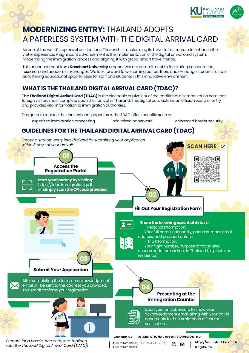 ด้วยทางสำนักงานตรวจคนเข้าเมืองแห่งชาติได้ประกาศใช้ระบบสำหรับให้บุคคลชาวต่างชาติที่จะเดินทางเข้ามายังประเทศไทย ให้ดำเนินการกรอกข้อมูลออนไลน์ และจะเริ่มใช้ตั้งแต่ 1 พ.ค. 2568 เป็นต้นไป ในการนี้ฝ่ายวิจัยและความเป็นสากล โดยกองวิเทศสัมพันธ์ได้จัดทำข้อมูลแนวทางการกรอกในระบบ พร้อม QR Code มาให้บุคคลากรของมหาวิทยาลัยเกษตรศาสตร์ ที่มี partners ชาวต่างชาติ ซึ่งกำลังจะเดินทางเข้ามายังประเทศไทย ได้ให้ข้อมูลเพื่อความสะดวกในการเดินทางเข้ามาในประเทศ