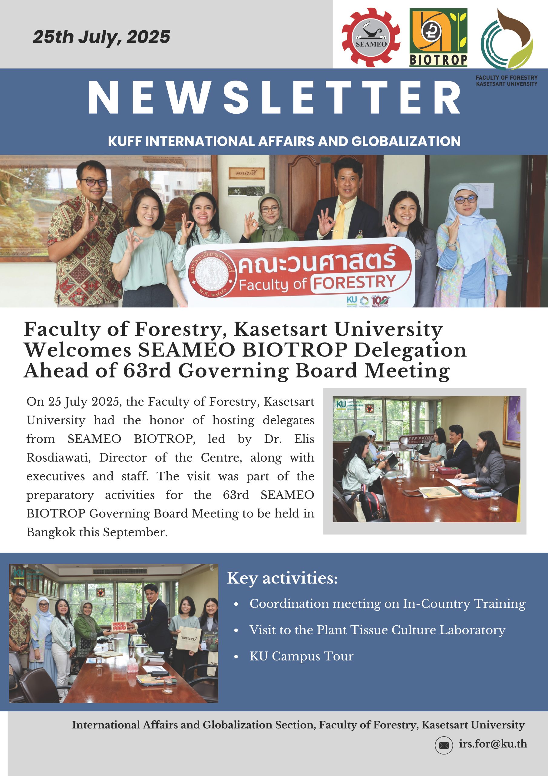 KUFF International Newsletter (25 Jul 2025) July 25, 2025 Biodiversity Education and Research Collaboration 25 Jul 2025 – KUFF hosted a visit from SEAMEO BIOTROP, including coordination meetings and a tour of the Plant Tissue Culture Laboratory, in preparation for the upcoming Governing Board Meeting in September 2025.